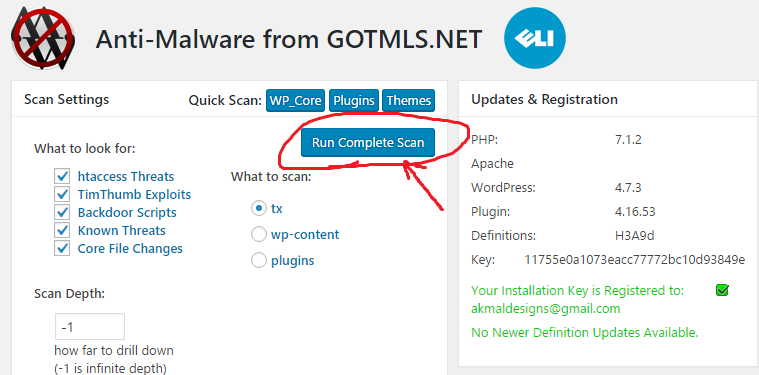Apa yang bagusnya saya install plugin ni, daftar email saya di ruangan sebelah kanan, download definition dia dan lepas tu terus klik Full Scan.